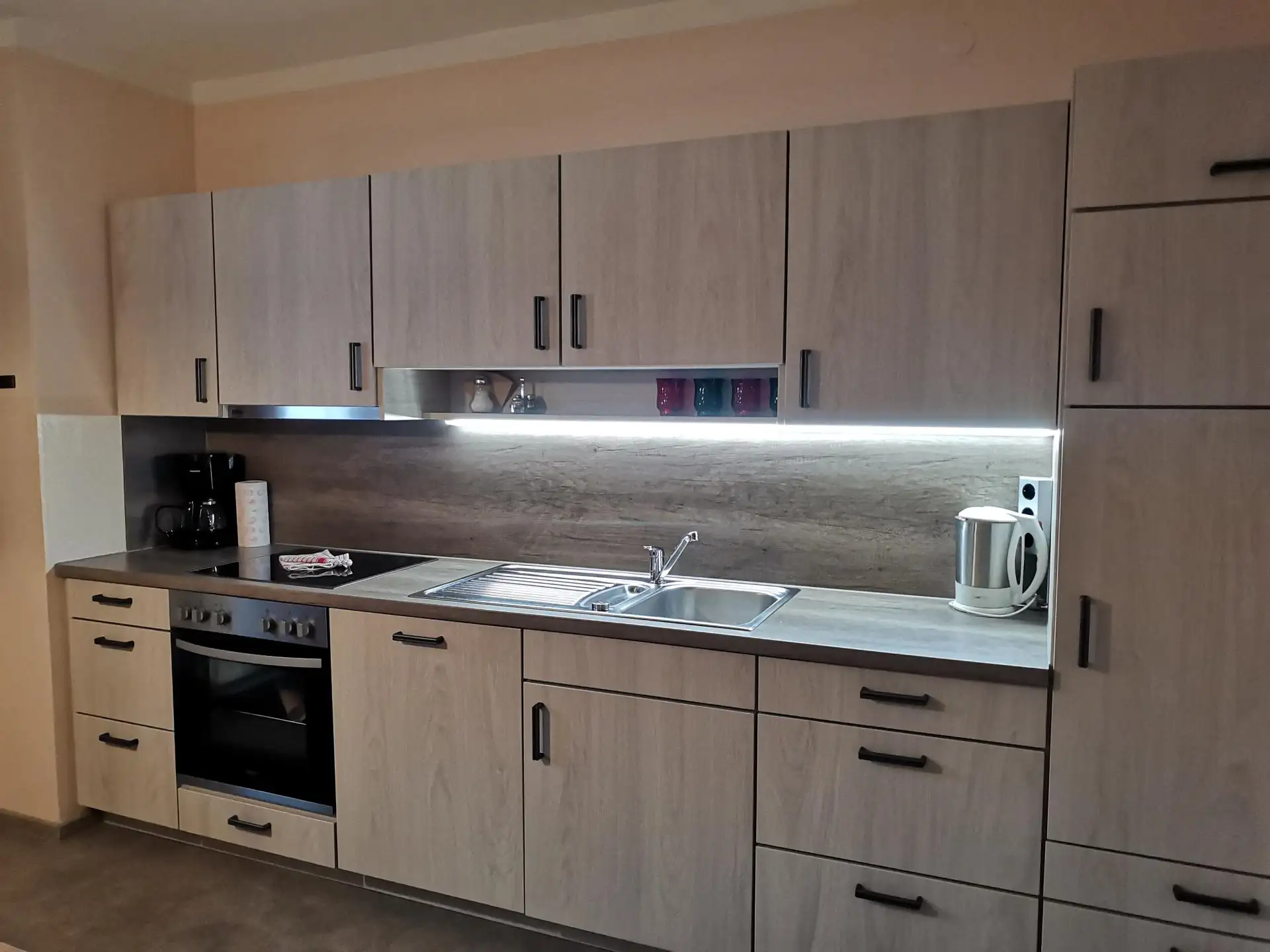 Das 100 m² große Appartement bietet viel Platz für Familien und Gruppen, die Komfort und Gemütlichkeit suchen. Die große Wohnküche lädt zum gemeinsamen Kochen und Essen ein, während das separate Wohnzimmer mit Sofa und Sitzecke ideal zum Entspannen ist. Zwei Dreibettzimmer sorgen für erholsamen Schlaf.